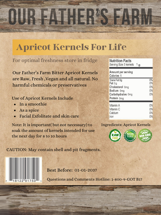 Our Father’s Farm is a family-owned natural health company founded in 1999, known for its organically grown apricot kernels and vitamin B17 products. With over 25 years of trust in holistic wellness, we specialize in premium bitter and extremely bitter apricot kernels, healthy snacks, and natural supplements for humans and pets. Our mission is “Planting the Seed of Health,” inspired by 3 John 1:2.