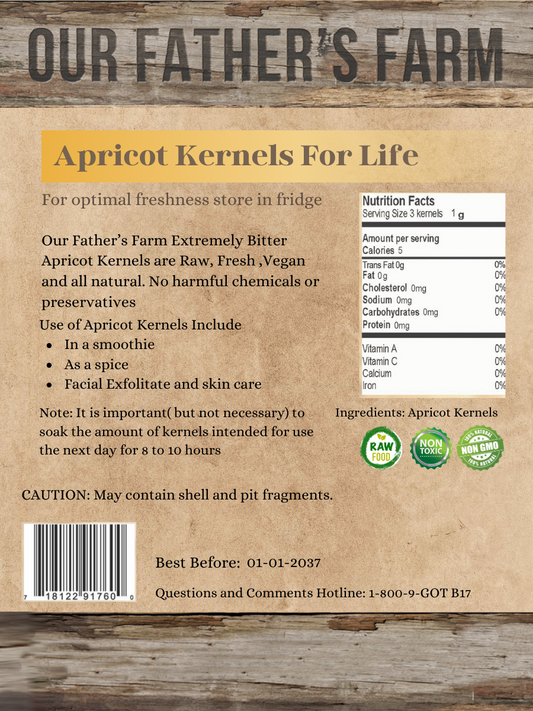 At Our Father's Farm, we proudly grow our exclusive brand of apricot kernels called Extremely Bitter. This unique cultivar ensures that our kernels are consistently bitter, providing the maximum benefits. You won't find this exclusive variety anywhere else! However, we produce only a limited quantity each year, so the demand often exceeds the supply.
